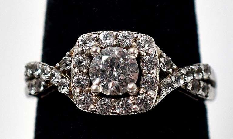 CZ Gemstone Ring in Sterling Silver. This adorable sterling silver ring displays a round cut CZ gemstone center with a halo of round cut CZ gemstones in a prong setting adorned with round cut CZ gemstone pronged on each shoulder. The size of this ring is 4 3/4. Total weight is 4.0 grams.
