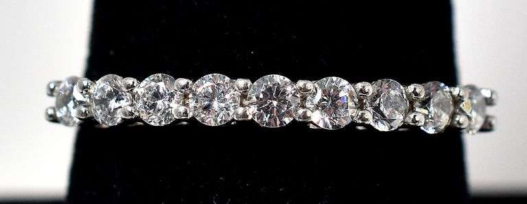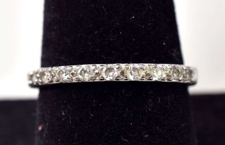 CZ Gemstone Band Ring in Sterling Silver. This adorable sterling silver ring displays round cut CZ gemstone in a channel setting. The size of this ring is 8 3/4. Total weight is 4.2 grams.