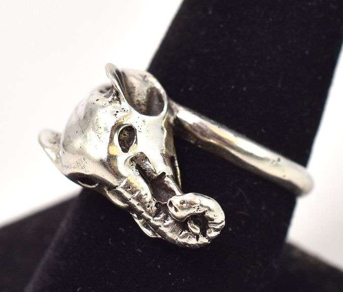 Elephant Ring in Sterling Silver. This adorable silver ring displays the head of an elephant in wrap kind of style adorned with a bright polish finish. The size of this ring is 8. Total weight is 7.6 grams.