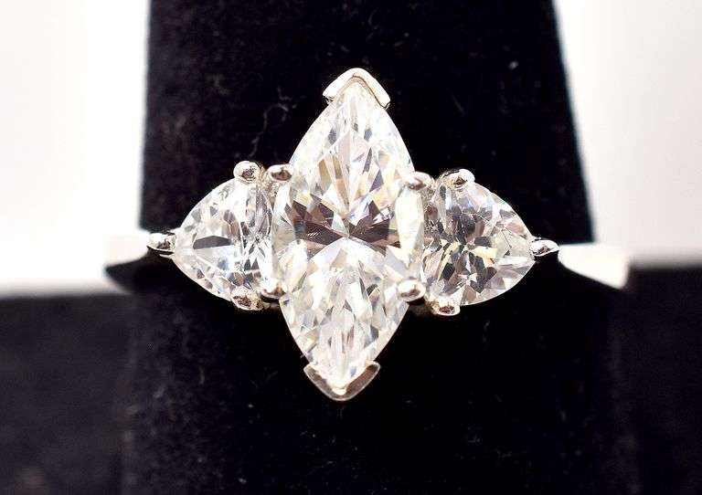 CZ Gemstone Ring in Sterling Silver. This adorable silver ring displays a marquise cut CZ gemstone center in a prong setting adorned with a trillion cut CZ gemstone pronged to each shoulder. The size of this ring is 9 1/2. Total weight is 4 grams.