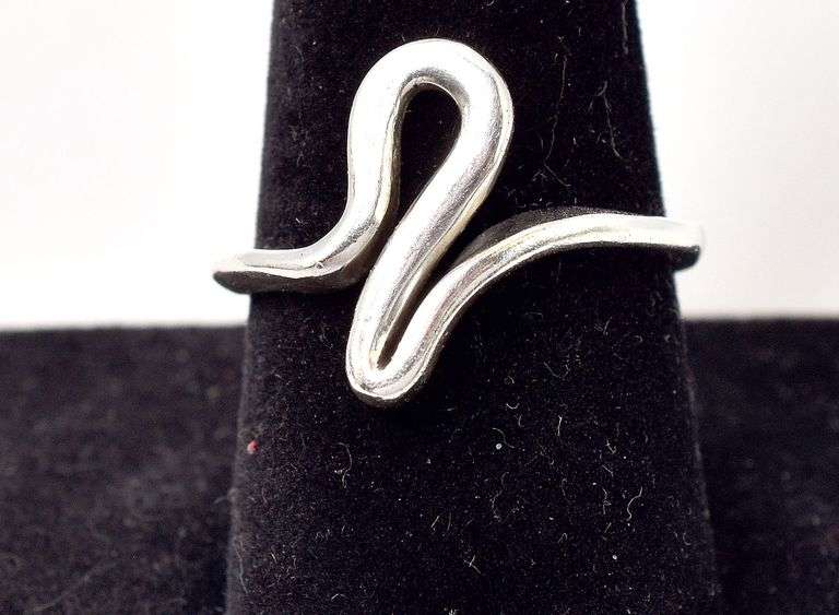 Sterling Silver Ring. This adorable silver ring displays an interesting flowy bypass band design. The size of this ring is 8 1/2. Total weight is 3.4 grams.