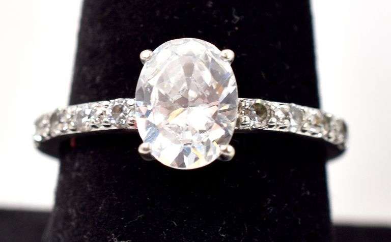 CZ Gemstone Ring in Sterling Silver. This adorable silver ring displays an oval cut CZ gemstone in a prong setting adorned with 4 round cut CZ gemstones pronged on each shoulder. The size of this ring is 8 1/2. Total weight is 3.2 grams.