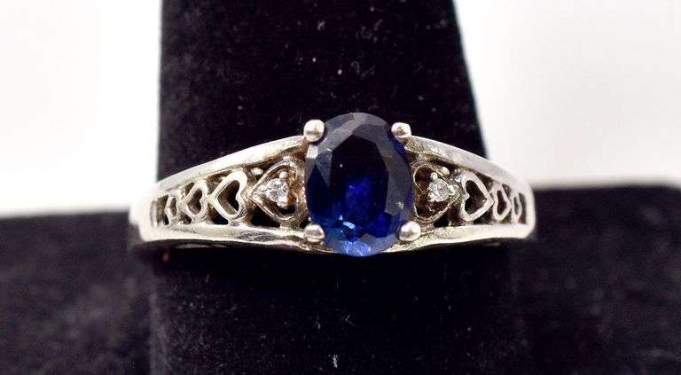 Blue Sapphire and CZ Gemstone Ring in Sterling Silver. This adorable silver ring displays an oval blue sapphire gemstone in a prong setting mounted with a round cut CZ Gemstone pronged on each shoulder adorned with an open silver heart work design on band. The size of this ring is 10 3/4. Total weight is 4.3 grams.