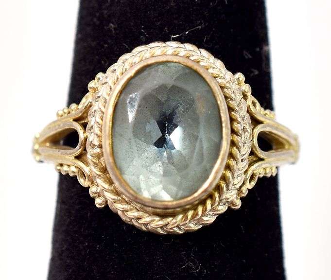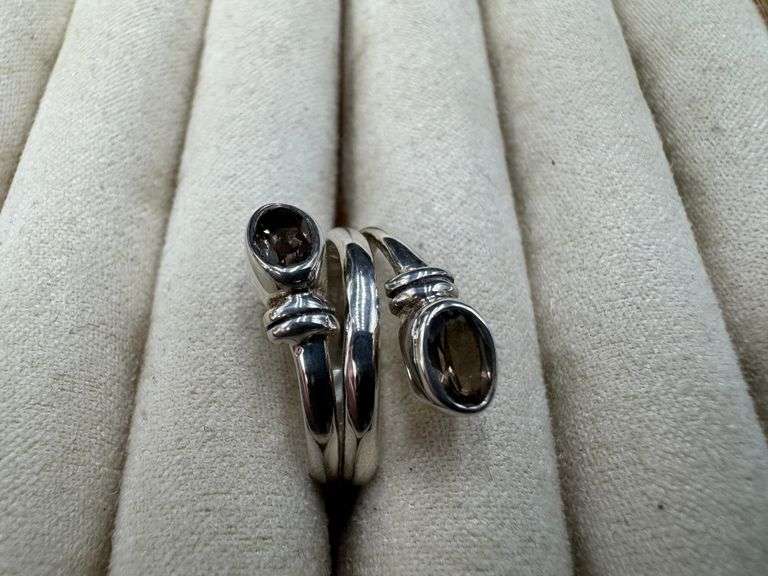 Smokey Quartz Gemstone Ring in Sterling Silver. This adorable vermeil sterling silver ring displays round cut smokey quartz gemstone in a prong setting in a twist like design. The size of this ring is 7 3/4. Total weight is 5.3 grams.