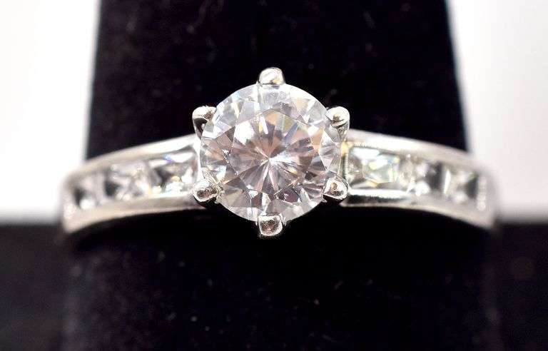 CZ Gemstone Ring in Sterling Silver. This adorable silver ring displays a round cut CZ gemstone pronged in the center adorned with three rectangle cut CZ gemstones in a channel setting. The size of this ring is 10. Total weight is 3.8 grams.