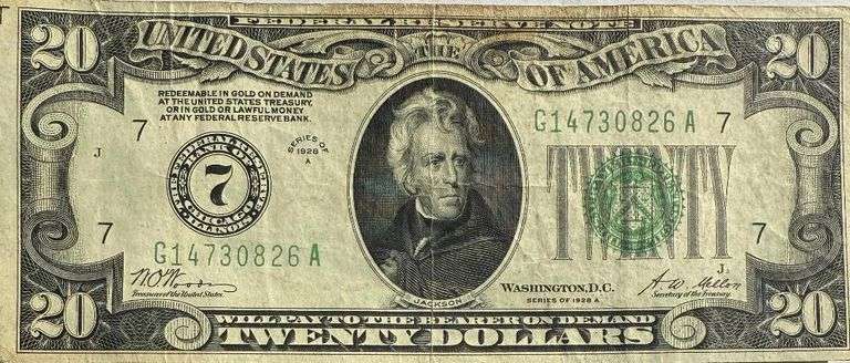 Popular 1928 A Series $20 Numerical FRN. Fr Nice centering and portrait. Dark green seal. Light soiling upper margin. No pin holes or tears