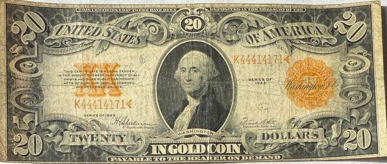 $20 Series 1922 Gold Certificate. Fr 1187. Real dark inking. Good centering and margins. No pin holes or tears. Two bands of large fibers Neat serial number. Gold certs very popular