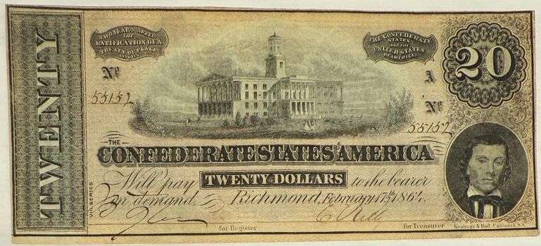 Choice Unc Feb 1864 Series $20 CSA Note. T 67. Fresh well inked and hand cut note. Signed bell. Nice light inked portrait and vignette. Some ink probably from signing on the reverse.
