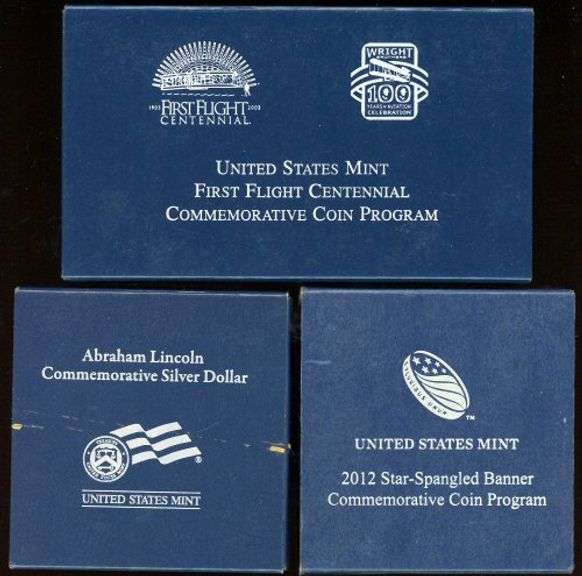 Three, all different, Proof Commemorative Silver Dollars, all still housed in their original packaging and with CoA, as issued by the Mint. Includes the 2003 First Flight Proof Silver Dollar, the 2009 Abraham Lincoln Proof Silver Dollar, and the 2012 Spar Spangled Banner Proof Silver Dollar.