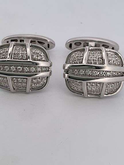 Gorgeous 18k white and yellow gold cufflinks with 56 diamonds marked on the cufflinks as 90 points total weight. The diamonds are of a nice quality as befitting this piece. The cufflinks weigh 13.1 grams.