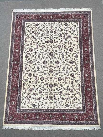 Authentic Jaipur rug, 100% natural vege dye wool pile, very heavy and thick pile, Burgundy, Ivory, green accent colors, designed and hand knotted in India