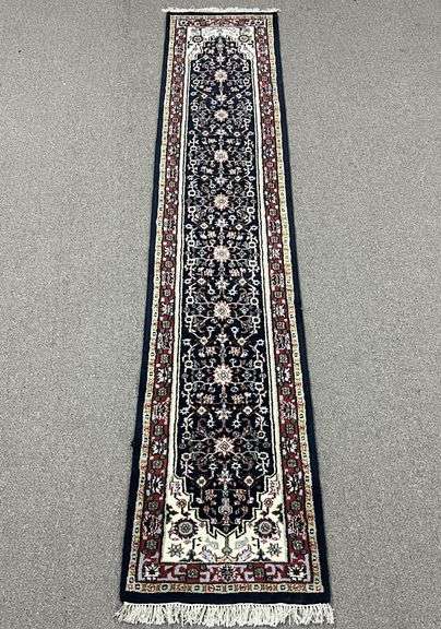 Hand Woven Tabriz Design Runner. Size 2.5x12.1 ft., made of quality wool pile on cotton foundation, finished off beautifully with a floral borders. Hand woven in India.