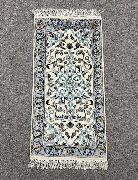 Hand Woven Nain Design Rug. Size 2.0x4.0 ft., made of quality wool pile on cotton foundation, finished off beautifully with a floral borders. Hand woven in India.