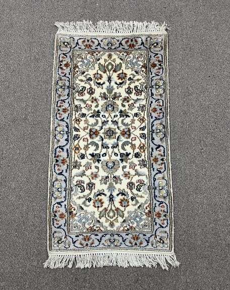 Hand Woven Nain Design Rug. Size 2.1x3.11 ft., made of quality wool pile on cotton foundation, finished off beautifully with a floral borders. Hand woven in India.