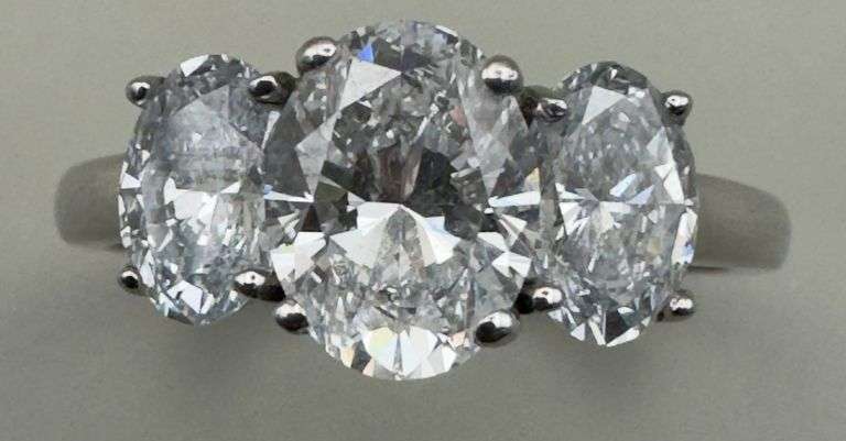 Ladies 14k white gold three stone ring with lab grown diamonds. There are three gai certified grown in the us diamonds. Diamonds weighing a total of 2.00 carats. Diamonds are e- f in color and vs in clarity. Ring size is 6.5 (can get easily resized by your local jeweler). Weight of gold is 3.3 grams. Ring is brand new from store display. Stamped 14k.