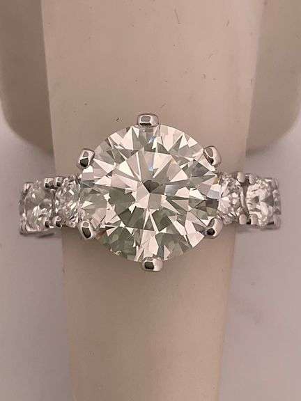 Certified brand new 14k white gold diamond engagement ring. It has 8.53 carats of lab grown diamonds . Center diamond is round brilliant cut 5.03 carats certified by I.G.I , it is E color and VS1 clarity, set in 6 prongs. Side diamonds are also round brilliant cut totaling 3.50 carats, these diamonds are d-e color and vvs clarity. Ring is size 7-can resized by your local jeweler. Gold weight is 8.5 grams. Stamped 14k. This ring is brand new-never worn. Center diamond is certified by I.G.I. The ring is certified by C.G.L, certificate #2059489834157009. Can be verified at cgl-labs.Com. This is a very large and impressive ring.