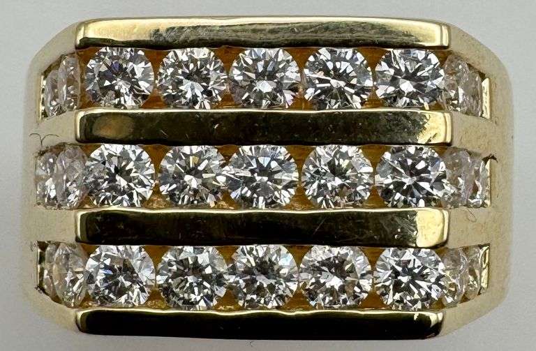 This beautiful 14K yellow gold diamond ring features 2.70 carats of round brilliant cut diamonds, expertly set in a sleek channel setting. The diamonds, boasting exceptional F-G color and VS1/VS2 clarity, exude radiant brilliance and sophisticated charm. Crafted with earth-mined diamonds, this piece reflects natural beauty and authenticity. Sized at 10 and easily resizable, this timeless ring offers a refined yet luxurious statement. Weighing 15.8 grams, it is stamped 14K.
