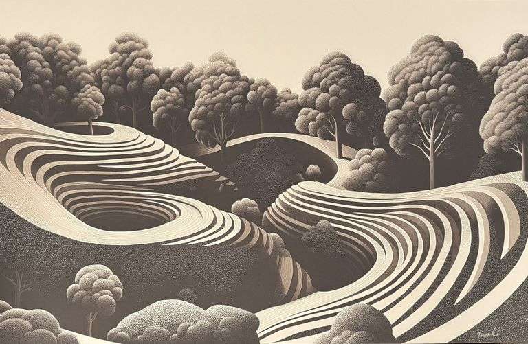Japanese limited edition print signed by Tamaki. Titled: Abstract Garden I. A surreal black-and-white landscape twists reality with flowing paths and textured trees that echo M.C. Escher’s style. The terrain warps and curves in impossible ways, blending natural forms with mathematical precision, creating a hypnotic and dreamlike environment. Artwork is signed. Artwork size 13 x 19.