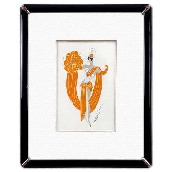 "Final, les Velours, 1955 for Narcisse" is an original gouache painting on paper by Erte (1892-1990), hand signed by the artist. This piece comes framed. Includes Letter of Authenticity. Measures approx. 21.5" x 17.5" (frame), 14" x 10" (image).Due to being previousl displayed in a gallery there is wear on the frame (corners).