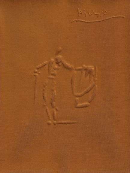 This work by Picasso is an embossment on Harpgaon cloth from the Moulin Richard de Bas edition limited to only 30 in the edition. It has an embossed signature and measures at 14 ½ x 11 inches and comes with a certificate of authenticity.