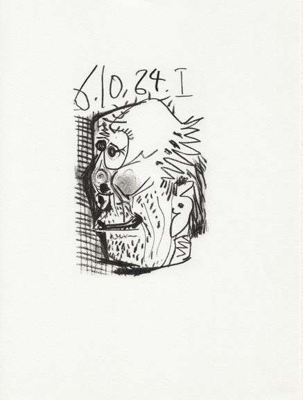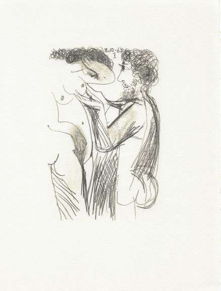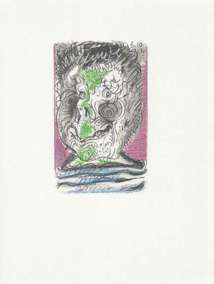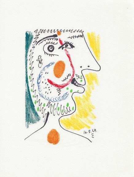 Highly collectible lithograph in colors on Arches paper by Pablo Picasso from his “Le Gout Du Bonheur” portfolio. “Le Gout Du Bonheur” is based on Picasso's sketchbooks from 1964, featuring comical self-portraits and other playful and erotic drawings, This work is from the edition of 666, published in 1970 by Harry N. Abrams, New York and printed in the studios of Guenther Dietz, Munich, under the personal supervision of Picasso. This work is in the exact size of the original drawing, and was produced through a unique process that employs the same type of materials used by Picasso, instead of the usual printing inks. Comes with a certificate of authenticity and a copy of the original triage sheet from the portfolio.