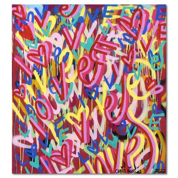 "Love" is an original spray paint painting on canvas by Chris Riggs, hand signed by the artist. This piece comes gallery wrapped. Includes Letter of Authenticity. Measures approx. 32" x 35" (image).