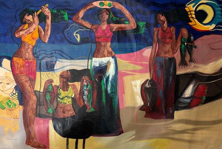 PHENOMENAL VERY LARGE BRIGHT ORIGINAL OIL ON CANVAS. HAND SIGNED BY THE ARTIST, THIS ARTWORK COMES UNSTRECHED AND UNFRAMED.