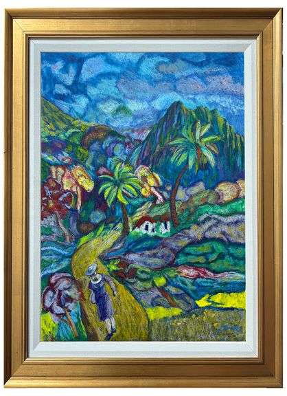 Original oil pastel on cardboard depicting a serene pathway through a lush tropical setting. Hand signed by the artist. Comes with a certificate of authenticity and beautifully framed, ready to hang.