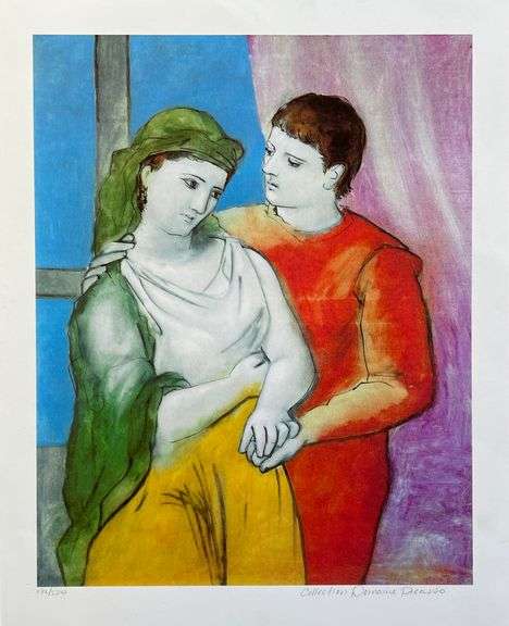This is a PABLO PICASSO (ESTATE COLLECTION DOMAINE) (1881-1973) giclee titled “THE LOVERS (CLOTHED)”. This piece is pencil hand signed on the lower right as ‘Collection Domaine Picasso’ and has an embossed seal stamped by the Picasso Estate. Pencil numbered from an edition of 500. Published on thick quality archival paper. Paper with border measures 26″ x 20″. In mint condition, comes unframed. This item is guaranteed as described.