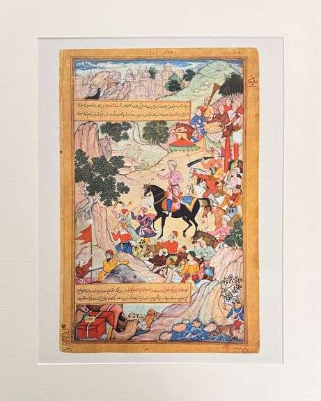 Highly collectible and rare 1950's vintage fine art plate of a Persian miniature painting, a vibrant form of illustrative art originating from the Persian Empire. This artwork on paper features intricate details, rich pigments, and gold accents, characteristic of Mughal or Persian school artwork. Comes professionally matted with a museum board ready to frame.