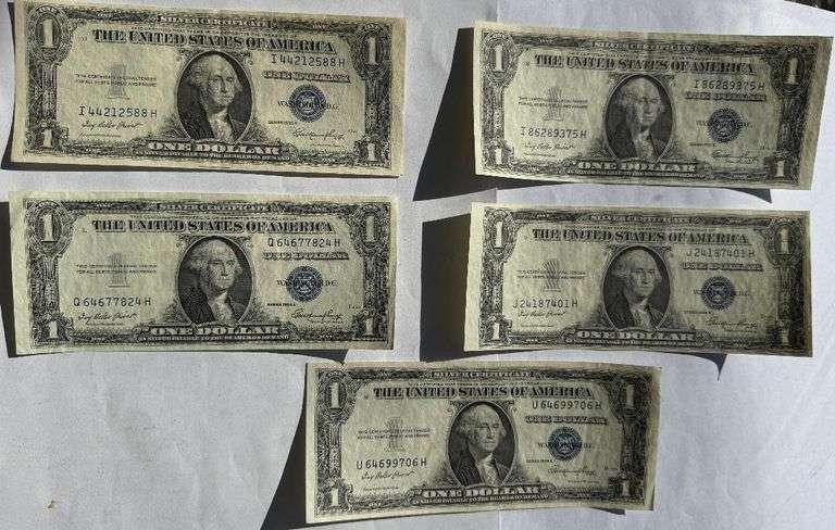 Five $1 1935E Near Unc Silver Certificates. Near unc /unc. Fresh and clean. Wavy paper with just some center creases. Some may be partial.