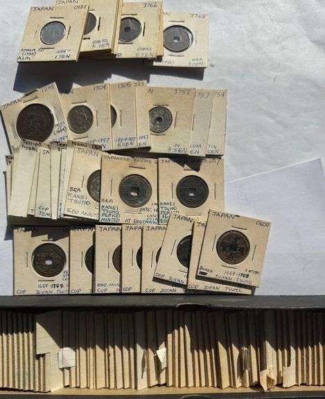 One Hundred Japan Coins. Probably from a dealers inventory from 50 years ago 1600 s to 1970 s. About half 1 mon. The other half seem to be pre and post WW11 One 20 sen silver and maybe one or two silver coins Several dragon coins No culls seen Various grades and metals Mostly in very old holders All coins identified Not my field