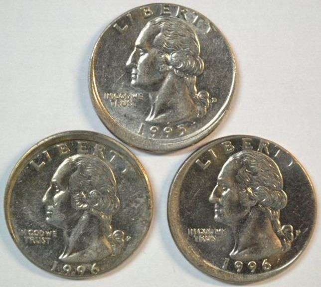 There is one from 1995-D and two from 1996-P in this lot of 3 off-center Washington Quarter errors.