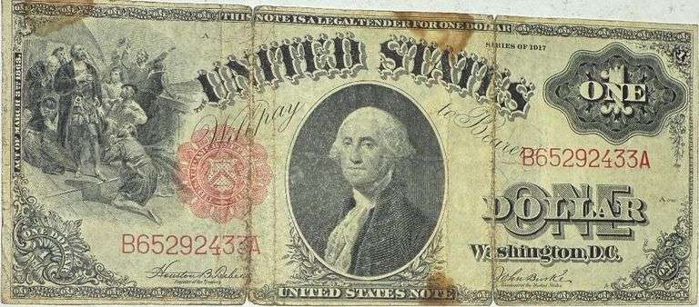 $1 Series of 1917 US Note. Fr36. Honest wear. Stress wear on the folds. Decent portrait. Good starter note. Not sure what the stains are.Two small sets of small staple holes. Decent centering