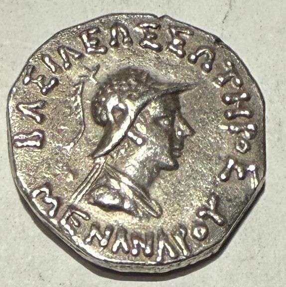 Baktrian Kingdom Menander 1 160-1145 BC Tetradrachm Silver 9.68 gram. Helmeted bust right/ Athena Alkidemos standing left. s 7597 Someone graded it about XF but seems a little nicer than that. Well centered Nice and thick. Nice bold relief. Well struck with good surfaces Showy coin.