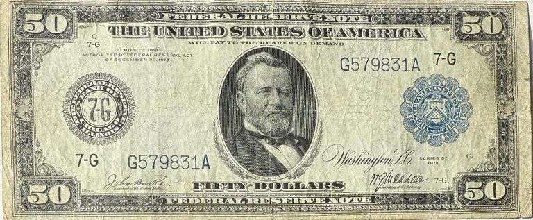 $50 Series 1914 FRN. Fr Decent centering and nice portrait. Lighter soiling and toning more so on the reverse. Two thick bands of fibers No pinholes or tears Nice looking reverse vignette