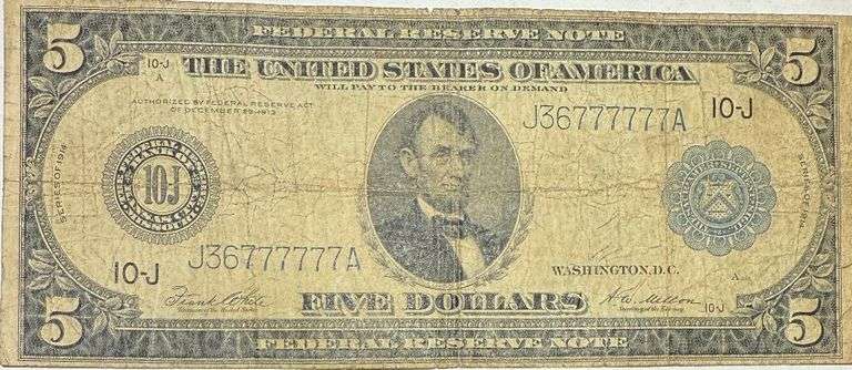 $5 Fancy Numbers Series of 1914 Kansas City FRN. Fr 833A. Just honest use and toning. Good starter note. Landing of William Penn and Columbus. Tear in the right margin not into the design. Right side of the sheet. Seal position A