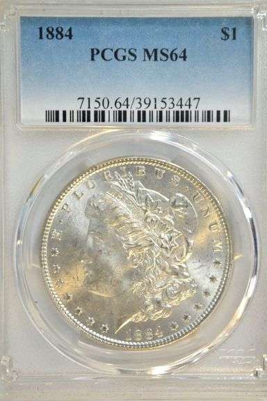 Better 'P' Mint Morgan Silver Dollar from 1884 in near Gem BU PCGS MS64 holder.