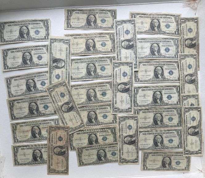 Thirty 1935 Various Series $1 Silver Certificates. Includes 1 star. Average circulated or better. No pinholes or graffiti. One minor tear.