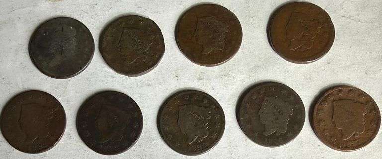 Nine Large Cents 1812-1827. Not quite full rim. Includes 1812 Classic Head, 2 1816 Matron heads (One dented), 1818,1821,1822 and 1825-7. All with decent color. Not checked for variety, errors or off center. Classic head with reasonable planchet. One off center in photo