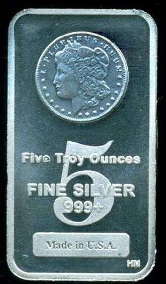 Morgan Silver Dollar design on this 5 Troy Oz pure .999 fine silver bar sealed in plastic.