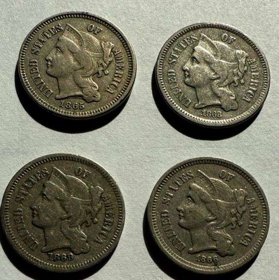 Four 3 Cent Nickels 1865 1866 1868 1869. Better than average circulated and decent lines in the columns. 1869 with minor brockage. 1868 with the face seen in the reverse of the first column