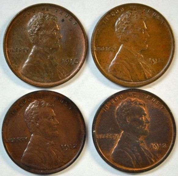 Choice original R&B Uncirculated 1910, 1911, 1912, & 1913 'P' Mint Lincoln Cents.