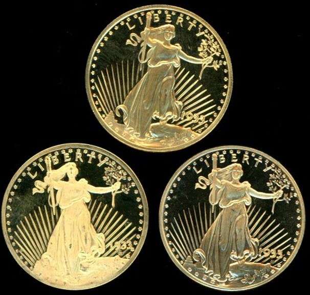Three very lovely Proof Replicas of 1933 Gold Pieces, each one made out of one ounce of .999 Fine Silver and then gold plated with a lovely proof finish.