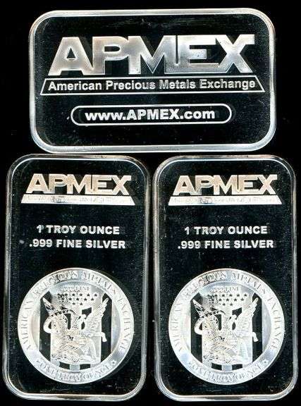 Three gorgeous prooflike 1 Troy Ounce Silver Bars made of .999 fine silver and minted by APMEX.