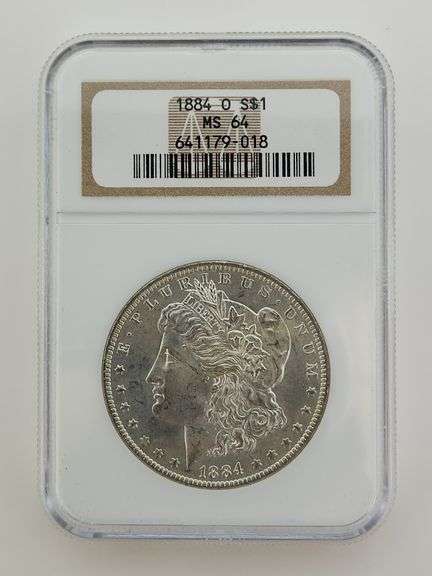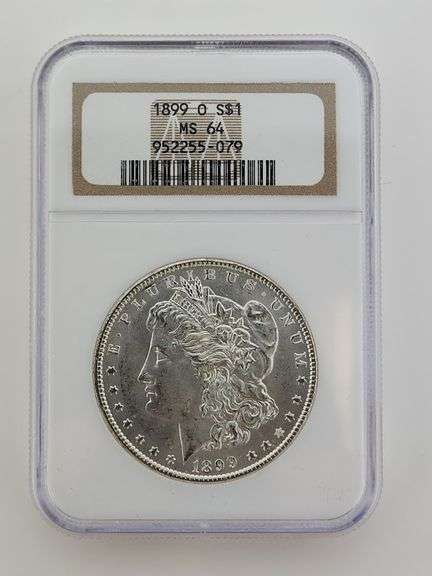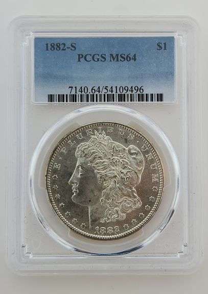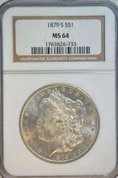 Frosty-white, fully struck nearly Gem BU 1879-S Morgan Silver Dollar that's in an NGC MS64 holder.
