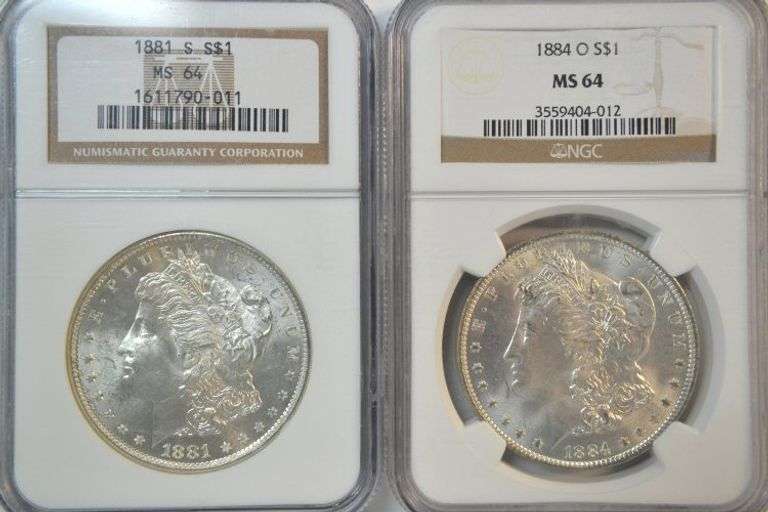 Super virtual Gem BU NGC MS64 graded Morgan Silver Dollars from 1881-S and 1884-O.