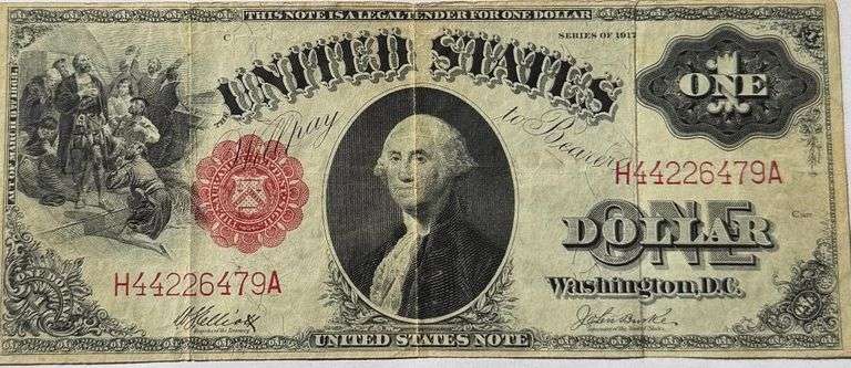 $ 1 1917 Series US Note Fr 37 Fairly clean note with 3 vertical folds. Nicer reverse. Two bands of large fibers Popular series with Columbus landing vignette