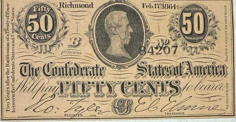50 Cent Series 1864 Unc CSA Note. T 72. Well hand cut with a decent amount of red. Popular denomination as there are only two in the series. Crisp signatures For some reason some ask a lot of money for them Background of portrait darker with no plaid pattern