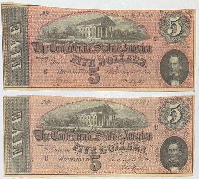 Two Consecutive Red $5 1864 Series CSA Notes. T 69. Amazing all these years together. and never circulated Rich portrait and vignettes'. Nice sharp reverse. Both uncs